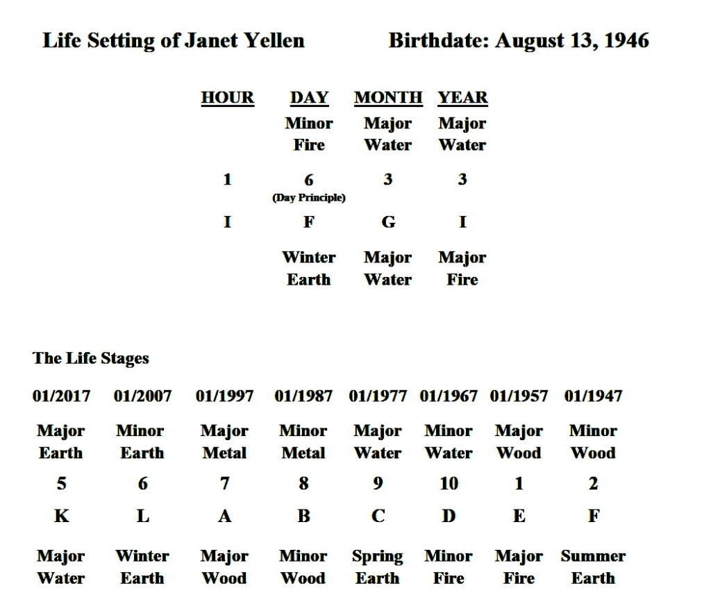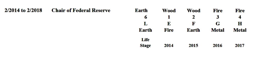 The copious quantities of fire and earth are clearly evident, demonstrating that Yellen’s day principle is on the weak side, which apparently benefited from strengthening the elements of fire and earth. This preliminary conclusion is further engendered by the cosmic energetic makeup of her life during her successful stint as the Federal Reserve Chair from February 2014 to February 2018: