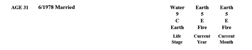 Without exact knowledge of the time column, it is difficult to discern whether the day principle is too weak or too strong based on the available birth data for Janet Yellen. So, we are going to conduct reverse engineering by examining her life events so far. She was married in June 1978, an auspicious event in her life. The energetic components of this day are as follows: