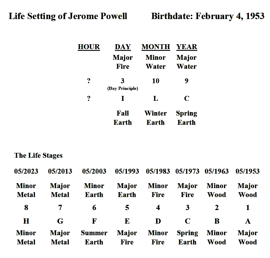 Now let us turn our attention to another crucial figure in the world of finance, the current Federal Reserve Chair, Jerome Powell. The life chart below shows that his day principle is major fire (3), reinforced by the major wood in the birth month column as well as the terrestrial pillar in the birth year column. Given that his day principle is excessively strong, it will do well by countering the wood and fire elements and by its rendezvous with earth, metal, and water. His life has had a very good run so far because his life stages up to now have been composed of these favorable elements. Starting in 2023, his next life stage will be filled with major fire, whereas the wood element in 2022 should bring about this change sooner. Once again, his good luck will turn bad towards the end of 2021or the beginning of 2022, much like that of Secretary Yellen and the President.