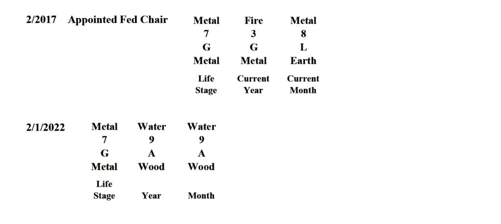 Yellen’s four years of service took place during her life stage of 6/L or earth/summer earth. As you can see in the layout, the earth element had retained its dominance, providing good fortune for her. Based on this assessment, it can be deduced that the elements of water and wood would bring about adversity in Yellen’s life, which is exactly what is going to happen when the year of the Ox (earth) transitions to 2022, the year of the Tiger (wood).