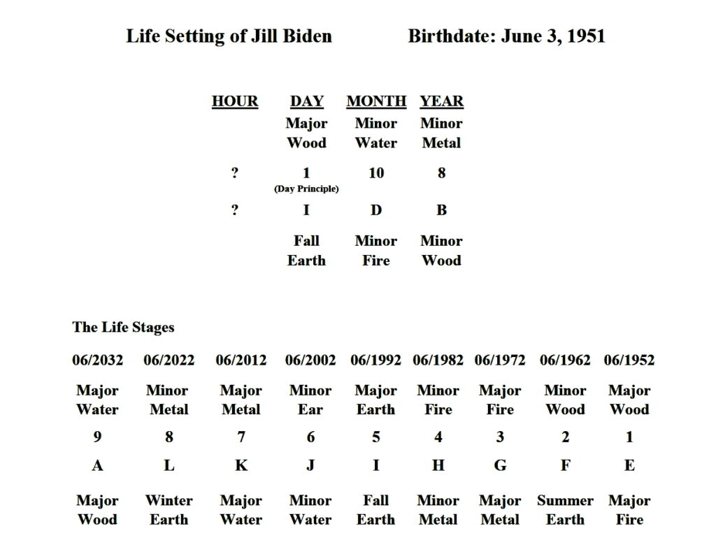 The day principle is 1 or major wood, which is supported only by 10 or minor water. Therefore, once again, this Bazi is a compliant type, characteristic of the wealth-compliant pattern, given that the day principle is sitting right on top of autumn earth I, which is strengthened by D, fire. So this Bazi is of the wealth-compliant pattern, which is strongly desirous of fire and earth but abhors water and wood. By the beginning of 2022, the year of 9/A or major water/major wood, Mrs. Biden will be in troubled waters, consistent with our overall assessment of the fortunes of first couple.