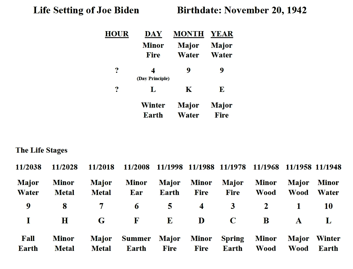 Notwithstanding the unknown hour column (time of birth) of Biden’s Bazi, there is no ambiguity as to which element dominates. Major water (9 and K) constitutes the birth month column as well as the celestial post (9) of his birth year, thereby extinguishing the fire of the day principal (4), highly typical of the “governor-compliant,” or “coon-compliant,” pattern of the life setting. The word coon in Chinese means “government official or controlling entity.” The English word tycoon was actually derived from a Chinese word meaning “big coon” or “high ranking government official, or a person of great influence.” According to the teachings of Bazi, when an element overwhelms the day principal, as water overwhelms the day principal minor fire (4) in the case of the president’s Bazi, the luck of the day principal paradoxically gets better when weakened and worse if strengthened. Once again, the strategy of “if you can’t beat them, join them” is at play here. Therefore, the wood and fire elements are bad for President Biden, whereas the metal and water elements are good for him. To confirm this impression, let us take a look at his past life events.