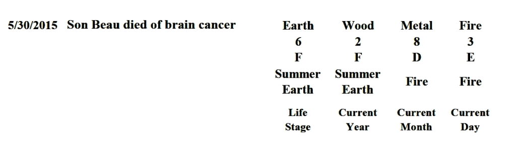 On May 30, 2015, unfortunately, tragedy struck again. This is the day when the President’s son Beau died from brain cancer. The energy makeup of that fateful date is as follows: